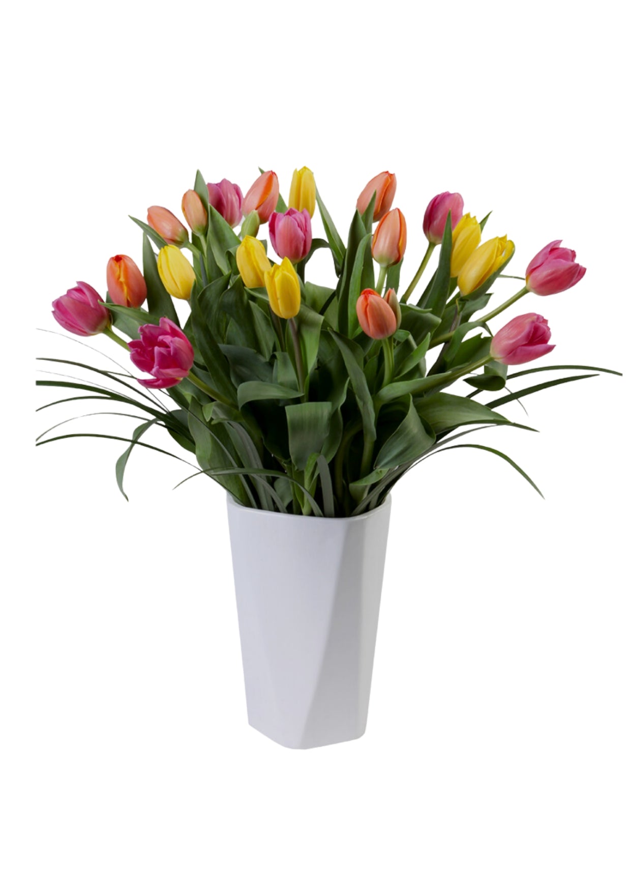 FLORERO BLANCO DE CERAMICA CON 20 TULIPANES TONOS VARIADOS Y COMPLEMENTO.