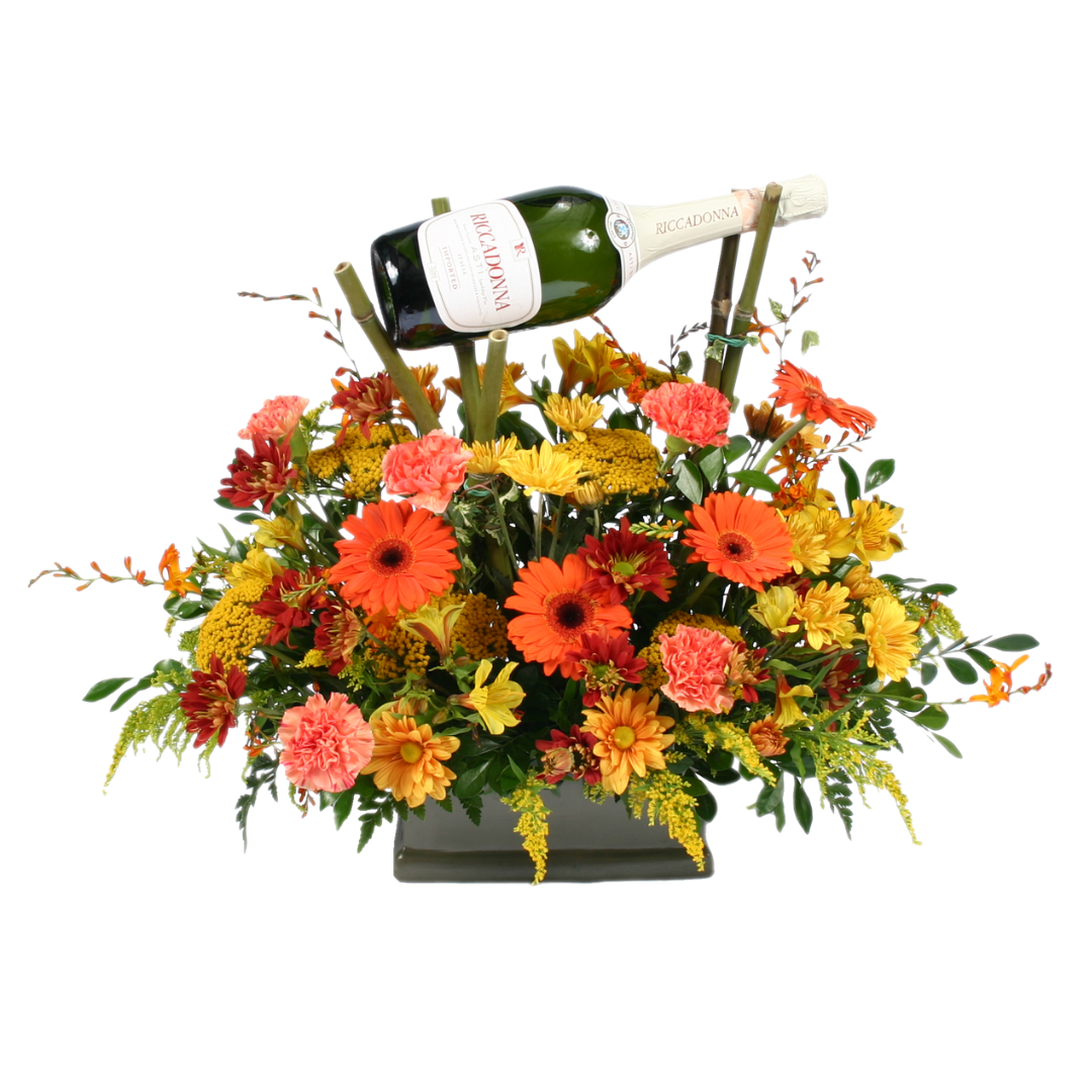 BASE DE CERAMICA CON FLORES VARIADAS Y MIXTAS EN TONOS NARANJAS Y AMARILLOS Y BOTELLA RICADONNA ASTI.