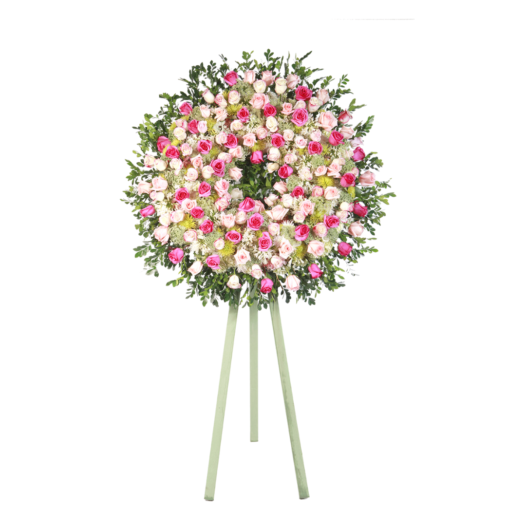 Arreglo de 2mt de altura, hortensias verde-blanca, rosas rosadas y fucsias, murralla, anastacia amarilla y follaje.