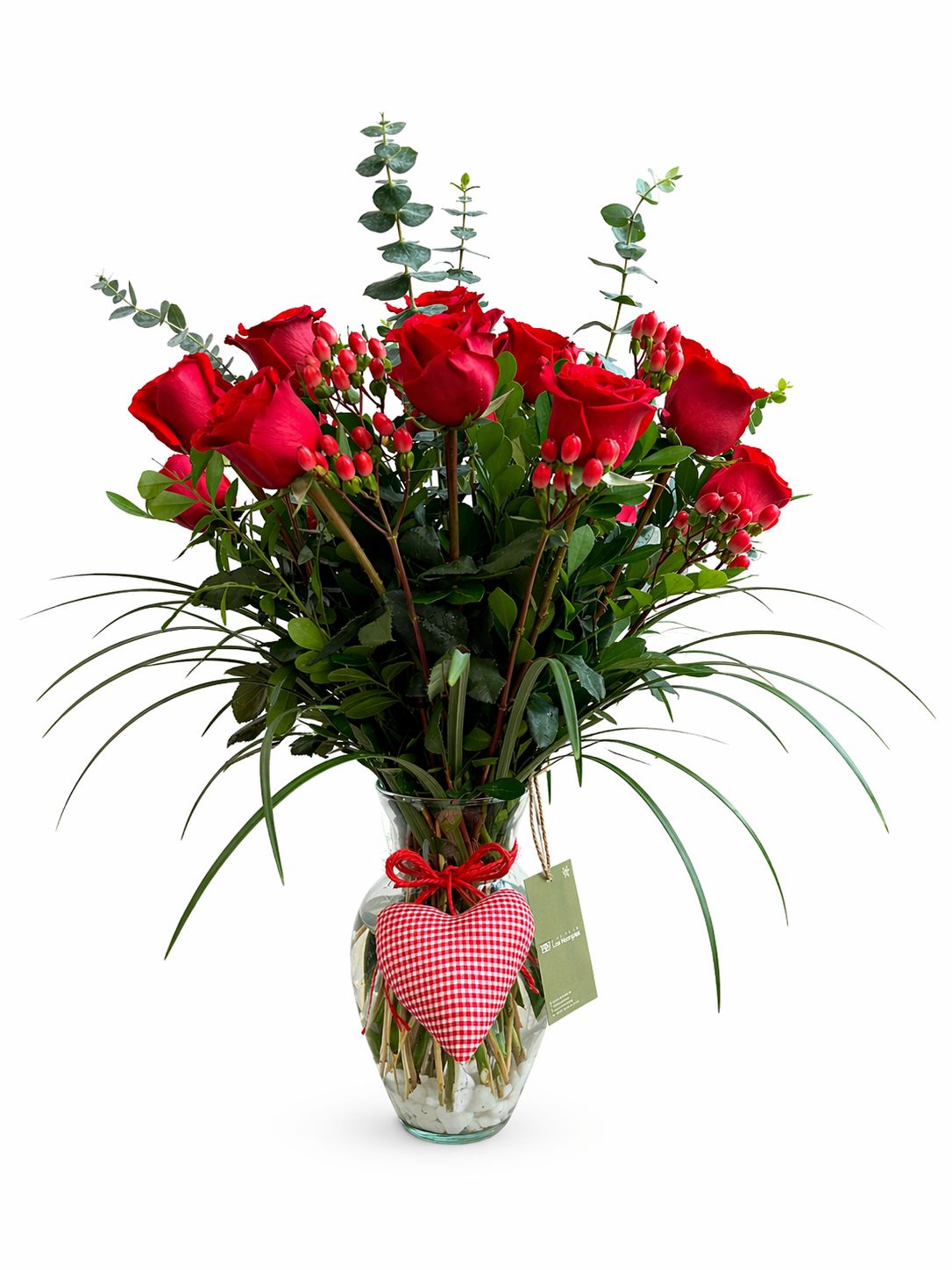 18 Rosas +follaje + florero de vidrio +corazon de tela + piedrita de cuarzo blanco + lazo decorativo
