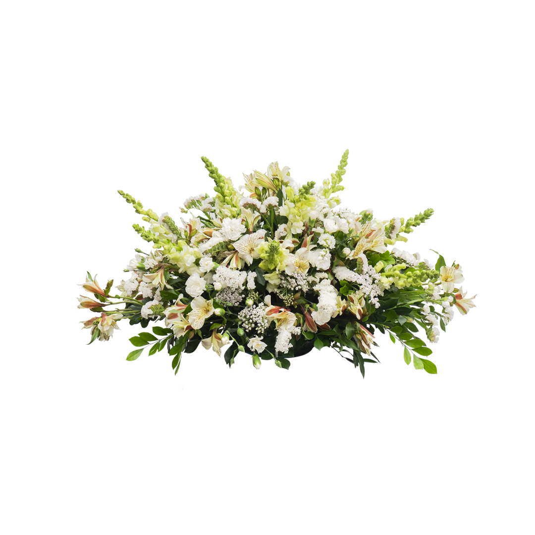 Arreglo en base de cerámica, astromelias, margaritas, dogo y complementos.