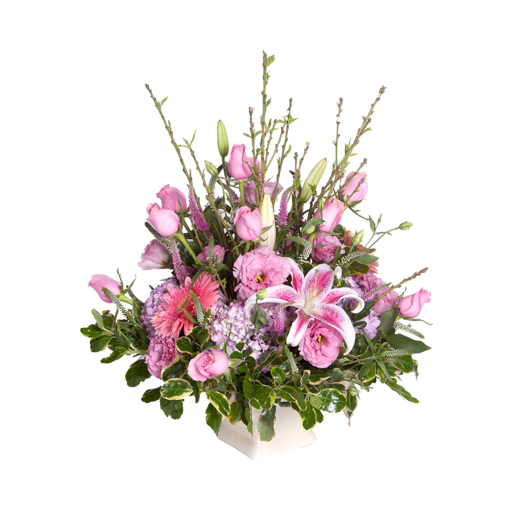 BASE DE CERÁMICA CON 12 ROSAS ROSADAS, GERBERAS ROSADAS, LILIUM ROSADO Y COMPLEMENTO.