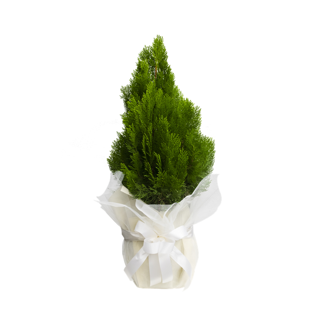 Pino decorado con papel blanco y yute.