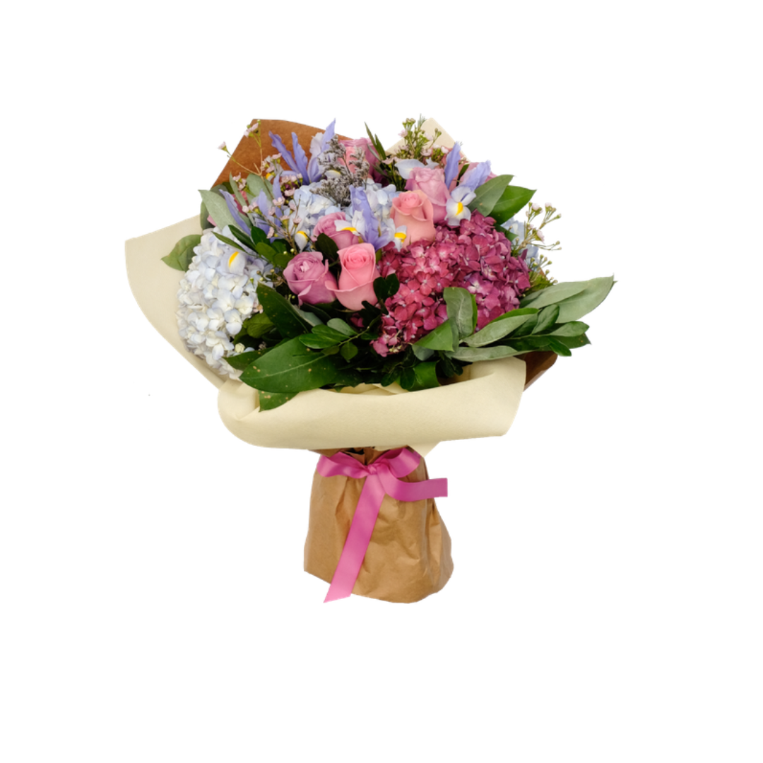 RAMO CON HORTENSIAS EN LILA, CELESTE Y ROSADA. CON COMPLEMENTOS. ENVUELTO EN HERMOSO PAPEL DECORATIVO DE ACUERDO STOCK EN TIENDA.