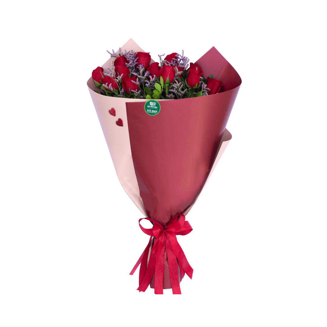 RAMO CON 12 ROSAS ROJAS Y COMPLEMENTOS. ENVUELTO EN HERMOSO PAPEL DECORATIVO DE ACUERDO A STOCK EN TIENDA.