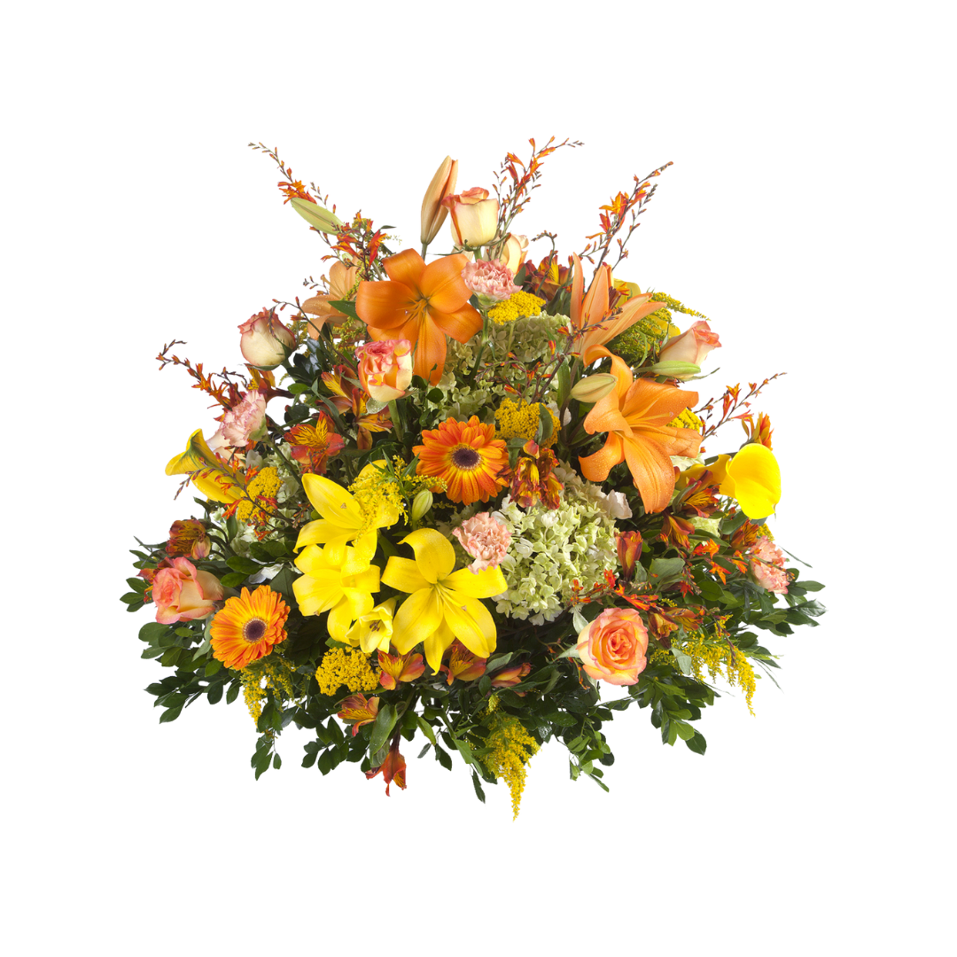 BASE DE CERAMICA, FLORES VARIADAS Y MIXTAS EN TONOS NARANJAS Y AMARILLOS.