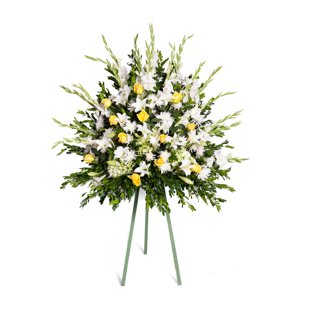 Arreglo de 1.50 mts. de alto, rosas amarillas, hortensia blanca, gladiolos, azucenas, murralla grande, silver dollar, anastacia amarilla, crisantemos blancos.